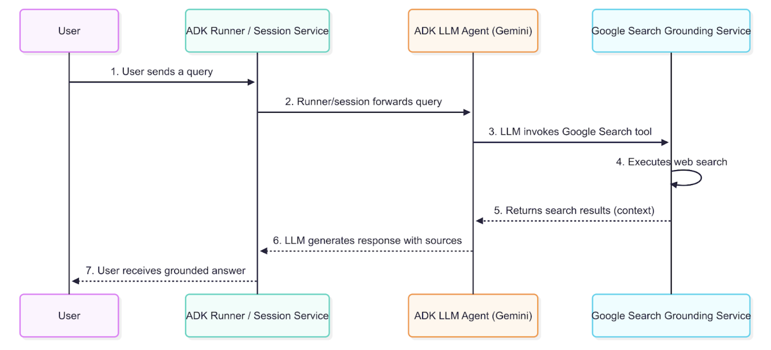 - ソース付きの応答の提示: ADKは、必要なソースURLとgroundingMetadataを含む最終的なグラウンディングされた応答を受け取り、帰属表示とともにユーザーに提示します。これにより、エンドユーザーは情報を検証し、エージェントの回答に対する信頼を築くことができます。