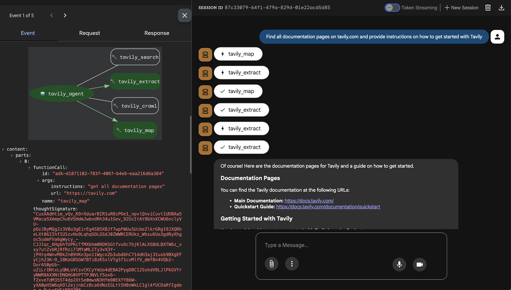 The agent automatically calls multiple Tavily tools to provide comprehensive answers, making it easy to explore websites and gather information without manual navigation: